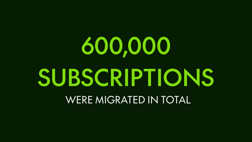 5. Rollout of 18 B2C subscription migrations – in order to mitigate risk, migrations were batched into several sizes: 100, 1.000, 10.000, and 50.000. The batch size was capped to 50.000 for several strategic reasons, and the calculation of eligible subscriptions was a complex mechanism built by Solvership, which allowed seamless bill runs with different forms of payment. The data migration followed the releases of functionality onto the target platform, and the rollout strategy was based on products, amongst other criteria.
