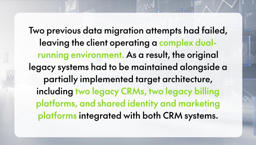 - Due to these unsuccessful previous programmes, the client was left with the original legacy system and a half-finished “to-be” architecture, both of which had to be run in tandem. This included: 2 legacy CRM’s, 2 legacy billing platforms, plus an identity platform and a marketing platform communicating with both CRM’s.