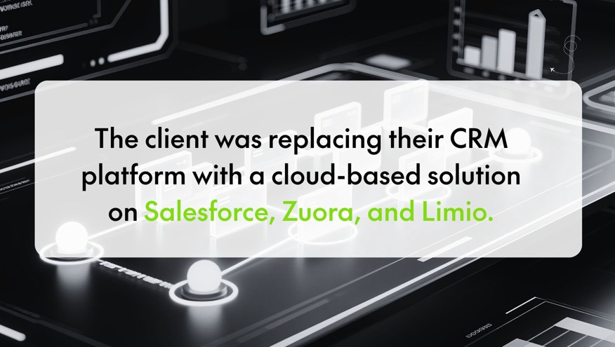 The client was replacing their highly-customised legacy CRM platform that had been in use for 13 years, with a cloud-based solution on Salesforce, Zuora and Limio. The main benefits of this Digital Transformation Programme were to: